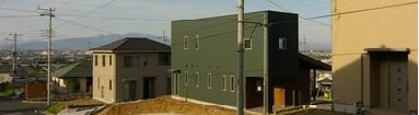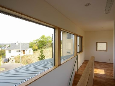 高崎市郊外の傾斜地に建つ小住宅。敷地は山肌を造成した傾斜地だけに、雄大に聳える榛名山を背景に、行き交う新幹線や市街の高層ビル、眩しい緑や田園風景が混在するのどかな現代都市の一端を俯瞰する。建設費用は1000万円台、若い夫妻のためのローコストな住まいである。広がるパノラマのような眺望を取り込む大きな開口部、屋外テラスと一体に使える床暖房が装備されたテラコッタの床面など、用意された周囲の自然環境に積極的に関わりながら暮らしたいという夫妻の思いが込められている。「快適に暮らしています。二人で庭造りもはじめました。コーヒータイムをご一緒に是非」と、念願のワイチェアーやテーブルが届いたからと嬉しいメールが届いたばかりである。