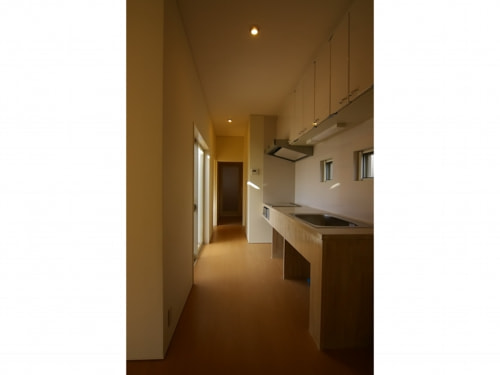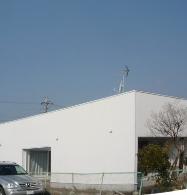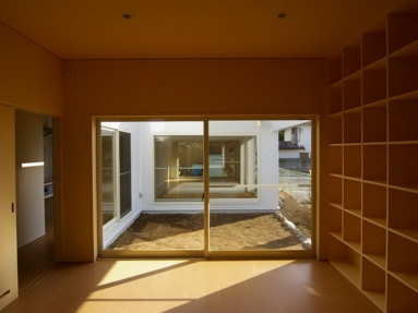 前橋市郊外にたつ女流美術家のためのアトリエ兼住まいである。1000万円以下で建てたいとの希望に沿って超ローコスト建築を目指しつつ、印象に残る爽やかでシンプルな現代建築としている。南面する大駐車場からの視線を遮り、各部屋には日の光を呼び込めるよう中庭を囲むように構成し、実面積以上のボリュームを実現している。写真は竣工間もなくで中庭の設えが整っていないが、現在は様々な山野草や木々が植え込まれ、植物と建築とが絡み合い、どの位置からも豊かな緑を感じられる、親しみやすい自然な空間に成長している。