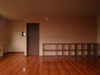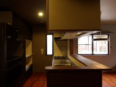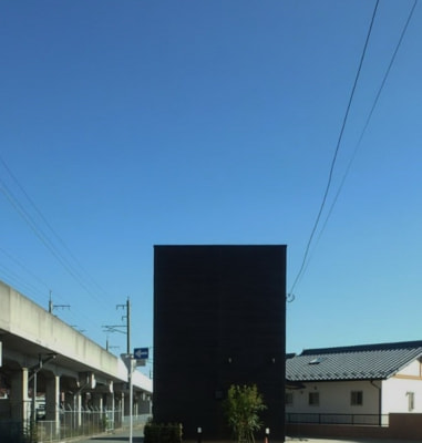県都前橋市の繁華街にほど近い中心市街地の一角に建つ、若い4人家族のためのローコスト住宅である。市内を縦断する国道からは僅かに入るが最近出来たばかりの「コメダ珈琲店」至近のこの道路の日中は騒音対策が必要なほどに交通量が多く、それ故に道路に面した北側ファサードは小窓を配しただけでマッシブに形づくられている。50万円/坪台という、この時勢では考え難いほどのローコスト建築として仕上がっているが、外部も内部も低コストで出来ていることを感じさせる要素は皆無である。南側には大きな開口が穿たれていて、敷地際にあった樹木の緑が一杯に入り込み、深い軒下にはゆったりとした物干しスペースが用意されている。街中とはいえ、快適な戸建て住宅としての魅力をしっかりと備えているのである。