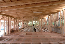 集成材の特質を生かす 大きな空間を支えるには木材を加工した寄木細工のように見える「集成材」を使用します。集成材の特長を生かすために接合部分を単純な構成とし、特殊な金物等を一切使わないで柱と梁とを固定する構造としています。そうすることで、ローコストながらも、ゆったりとした広がりのある空間が実現しています。