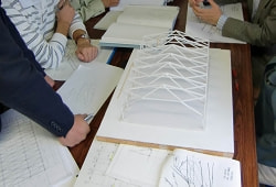 木構造の中でも最も複雑な加工を要するのは遊戯室の大空間を無柱空間としている梁の架構。先生自ら作成した構造模型とスケッチ図とを交えての現場会議も。施工監督・大工棟梁・木材加工担当者・設計事務所、各担当者が集まってのクライマックス時には実寸大のモックアップが登場…。