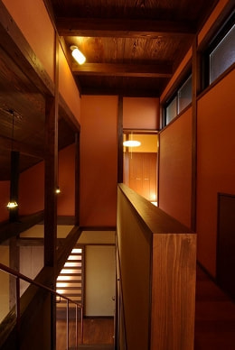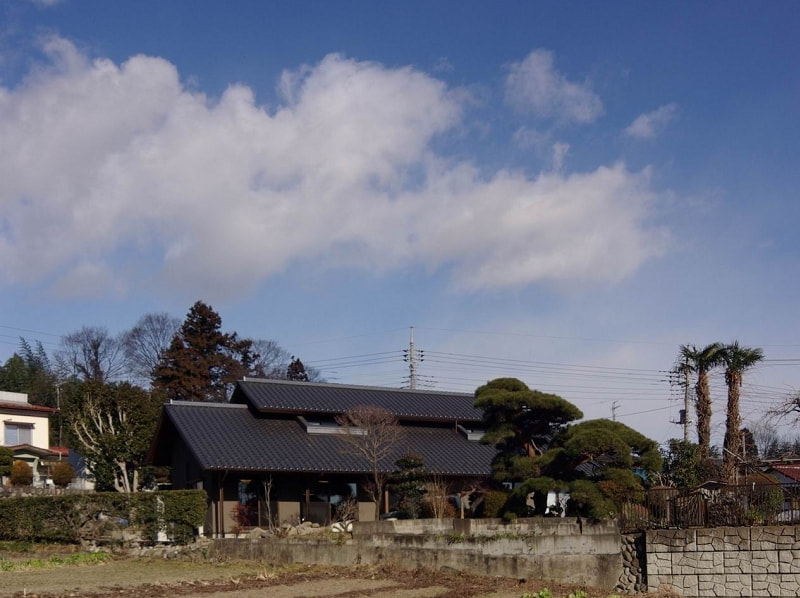 旧子持村・上白井に建設された現代「古民家」というべき新築の住まい。旧家を解体して残した大黒柱や主要な梁材を保存・伝承するため、新築家屋の要所に再利用しています。祖母を含む両親の世帯と若い長男家族の世帯、居住者は計7人ですが完全分離型の独立2世帯ながら総延べ床面積45坪、建設費も2,400万円(坪50万円台)に抑えた超ローコスト建築です。床天井は全てムク材、外壁はもちろん、内壁も主要部は塗り壁とし、低予算ながら古民家的素材をふんだんに使用しています。特徴的なのは平屋建ての大屋根構造に見せた2階建て建築としていることや、内壁の配色・シンプルなスチール製階段、玄関の吹き抜け空間等に現代和風建築の要素を取り入れ、モダンな要素を融合した建築としていることです。本格的な古民家建築の建設には大工棟梁の熟練した優秀な技術の裏付けも必要不可欠。こうした様々な要素の相乗効果で完成した建築でもあります。