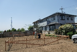 解体が終わると次は地鎮祭。「更地」に地縄が張られ位置の確認を行います。写真は地縄に基づいて「丁張り」が施されています。地鎮祭の準備中です。
