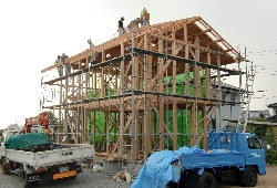 上棟とはあらかじめ大工が工場で刻んだ柱や梁の部材を搬入し、約二日ほどで現地で組み立てる作業のことを言います。当日は大工だけでなく工事に関係する鳶職人たちや電気屋さん、水道屋さんなど様々な職種の職人たちが手伝いに来ます。十数人の人たちが手伝い、見守る中で建物は徐々に姿を現すのです。