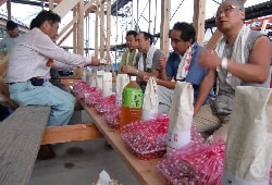 上棟式 通常は大工の棟梁が棟上をした建物のなかで神事を行います。建物の四隅で餅を投げたりのお祝いの儀式をするわけですが、今回は文字通り棟のてっぺんでの神事。はっぴを着た棟梁たちに混じって建築主のKさんも恐る恐る屋根の上に…。仕上げはお神酒を戴きながらのお祝いの儀。参集した職人たちにご祝儀まで振舞われ、立派な上棟式となりました。